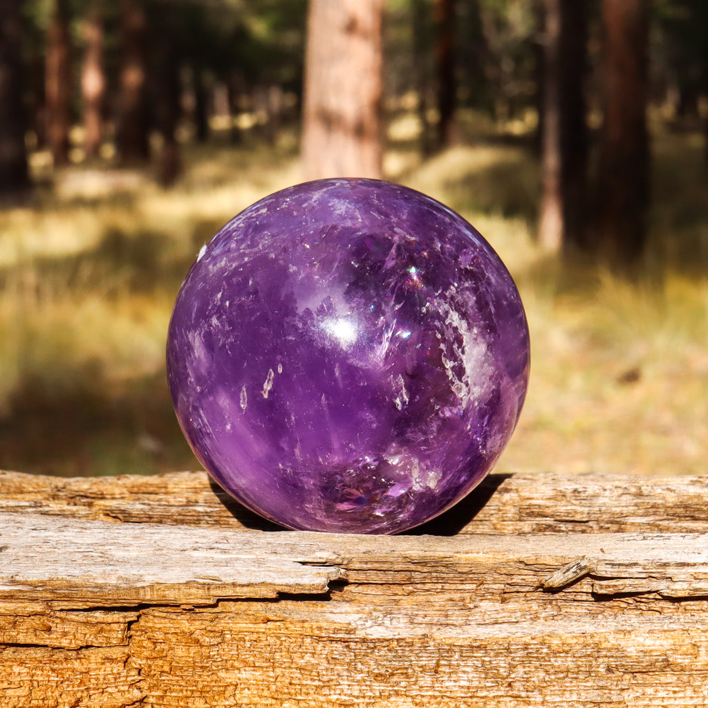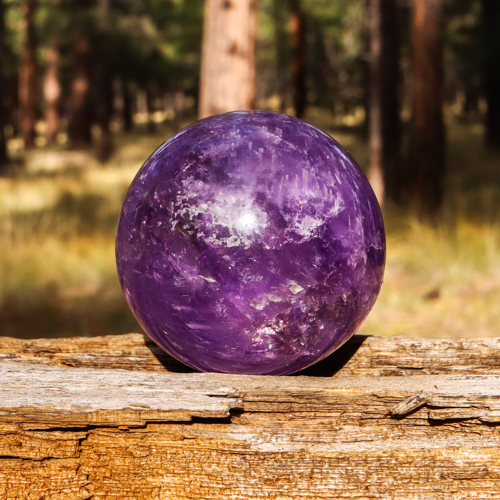 An artisanal carved Amethyst sphere. Includes a small circular stand