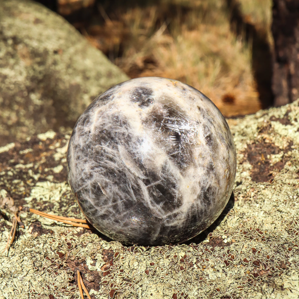 Moonstone is characterized by its milky sheen and inclusions of dark Feldspar. Moonstone carries balancing, reflective, introspective, and lunar energies which combine to aid in traversing uncertainty and changes in life. Black Moonstone is an exceedingly beautiful variant of Moonstone found primarily in Madagascar. A stone of self-discovery and positive change, Black Moonstone is a wonderful stone for carrying around.