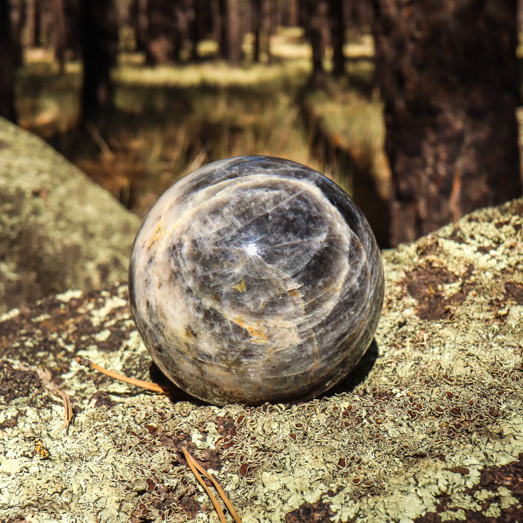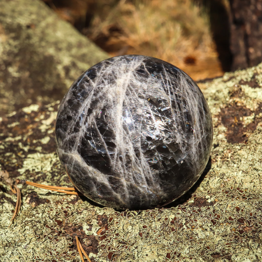 A beautiful Black Moonstone sphere with a magnificent silver flash. Includes small circular stand