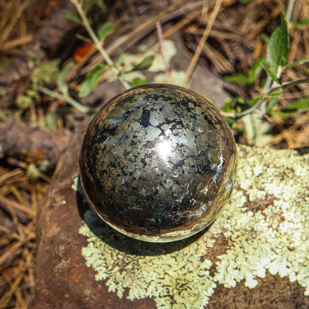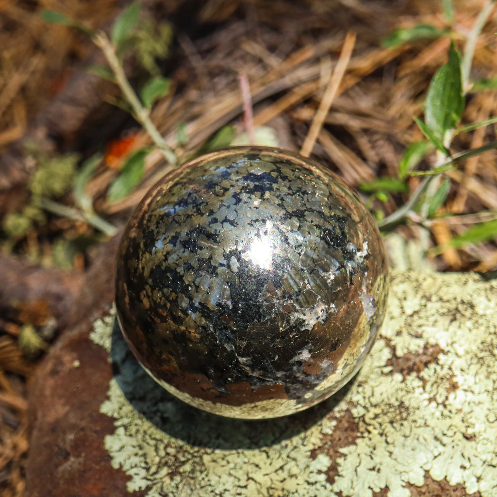 A beautiful, hand-carved Chalcopyrite sphere. Includes small circular stand.