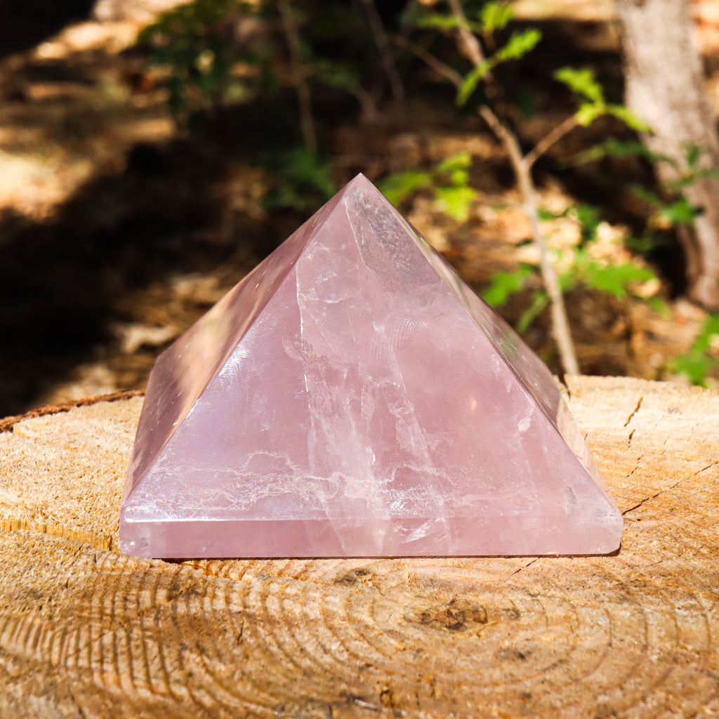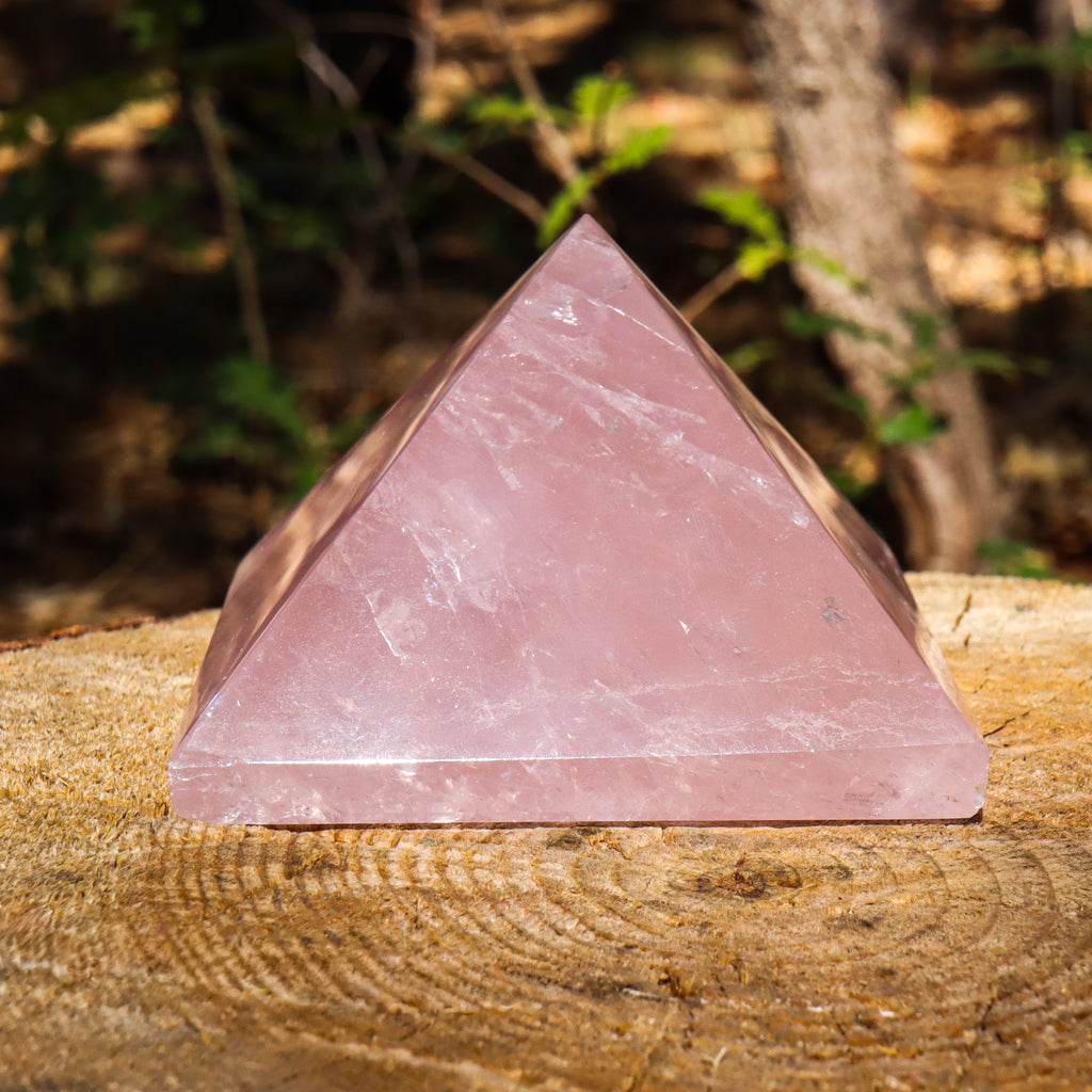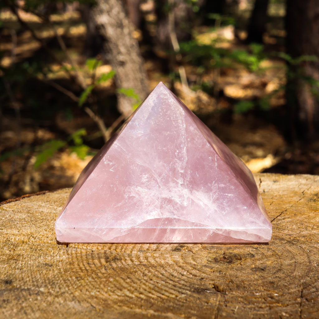 A beautifully carved Rose Quartz pyramid. Crystal Pyramids represent the most powerful and magnificent man-made structures in history and date back to the Ancient Egyptians who used them to enhance spiritual ascension. The angled sides of the Pyramid symbolized the Rays of the Sun, which facilitated the transfer of the bodily spirit from the material world into the Afterlife. Crystal Pyramids make powerful energy generators, which utilize their strong shape to store charged energy until released.