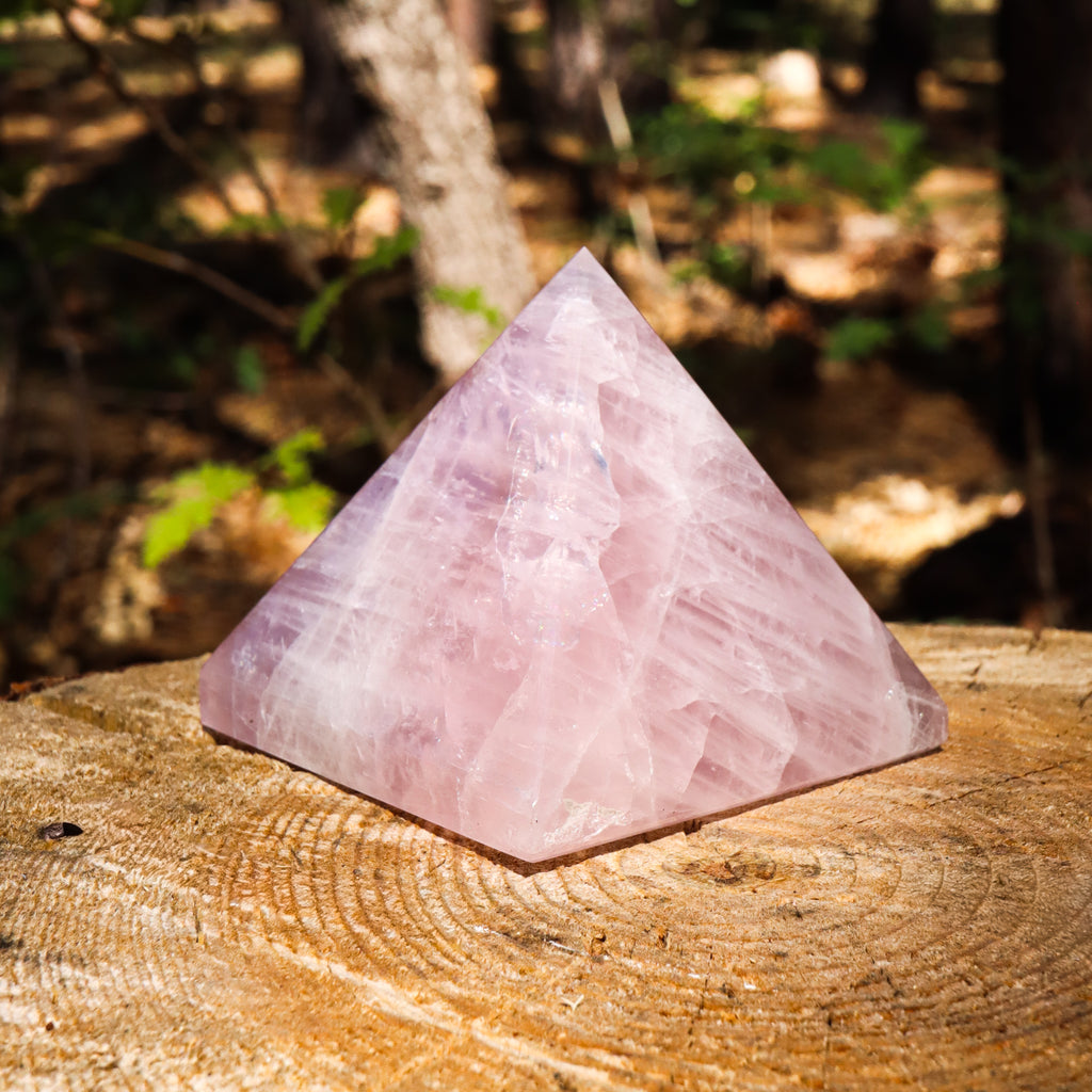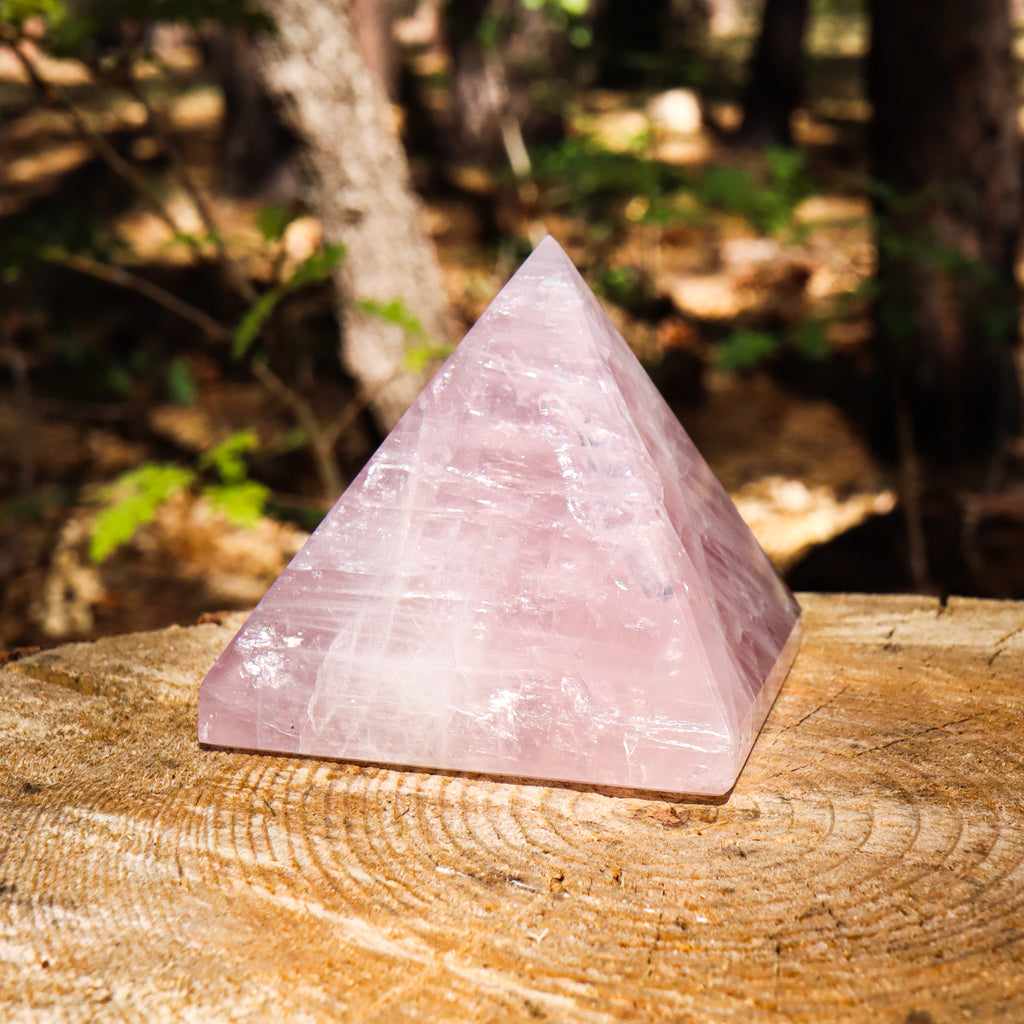 A beautifully carved Rose Quartz pyramid. Crystal Pyramids represent the most powerful and magnificent man-made structures in history and date back to the Ancient Egyptians who used them to enhance spiritual ascension. The angled sides of the Pyramid symbolized the Rays of the Sun, which facilitated the transfer of the bodily spirit from the material world into the Afterlife. Crystal Pyramids make powerful energy generators, which utilize their strong shape to store charged energy until released.