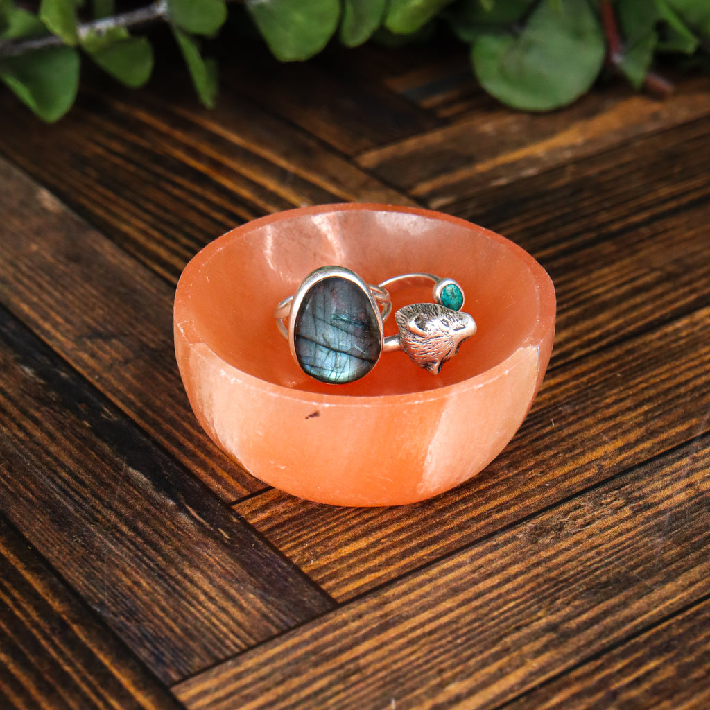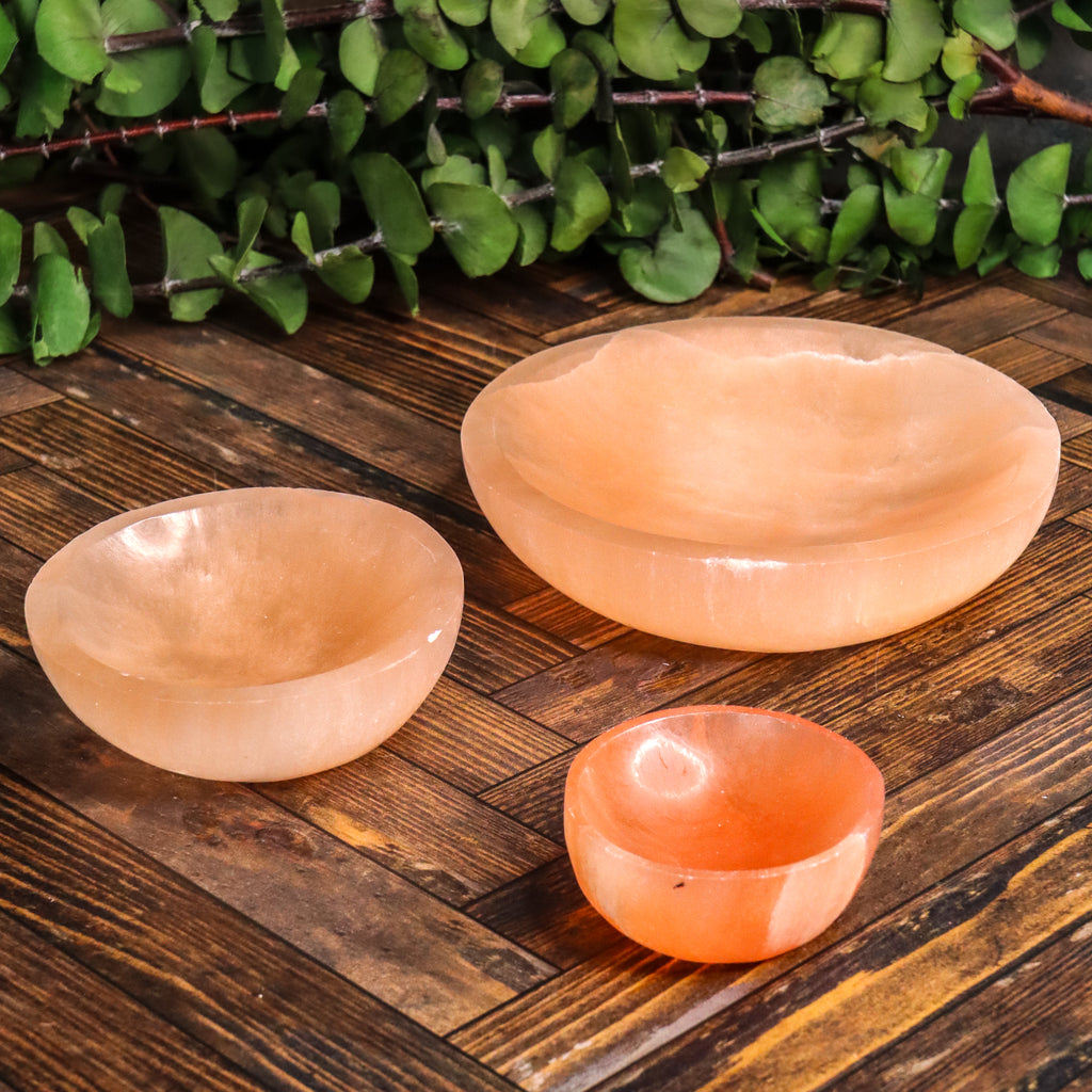 Peach Selenite Bowls are made of high-grade Selenite originating from Morocco, distinguished by their characteristic warm, muted peach to deep orange coloration. This hue connects the stone not just to the Crown Chakra like white Selenite, but also to the Sacral Chakra, encouraging feelings of creativity, well-being, and grounding while still serving as a beautiful display for smaller stones