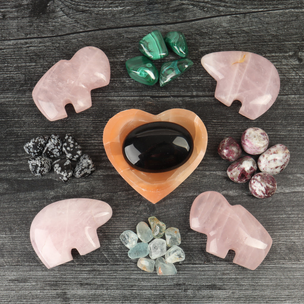 One tumbled Snowflake Obsidian, Pink Tourmaline, Malachite, and Blue Topaz, your choice between a breathtaking Brazilian Rose Quartz Buffalo or Bear, and a Mexican Black Obsidian Palm Stone. House your wonderful tumbled stones in either a Selenite Heart Bowl or a Peach Selenite Heart Bowl.