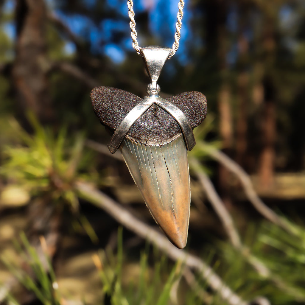 A beautiful polished double sided Shark Tooth Fossil pendant set in sterling silver. Chain not included