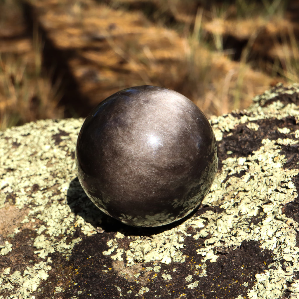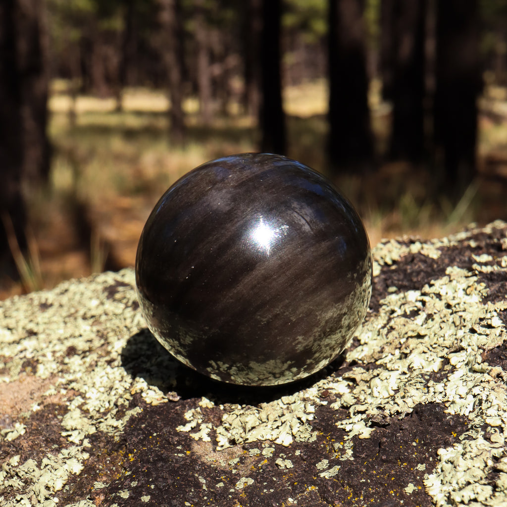 A brilliant Silver Sheen Sphere. Includes a small circular stand.