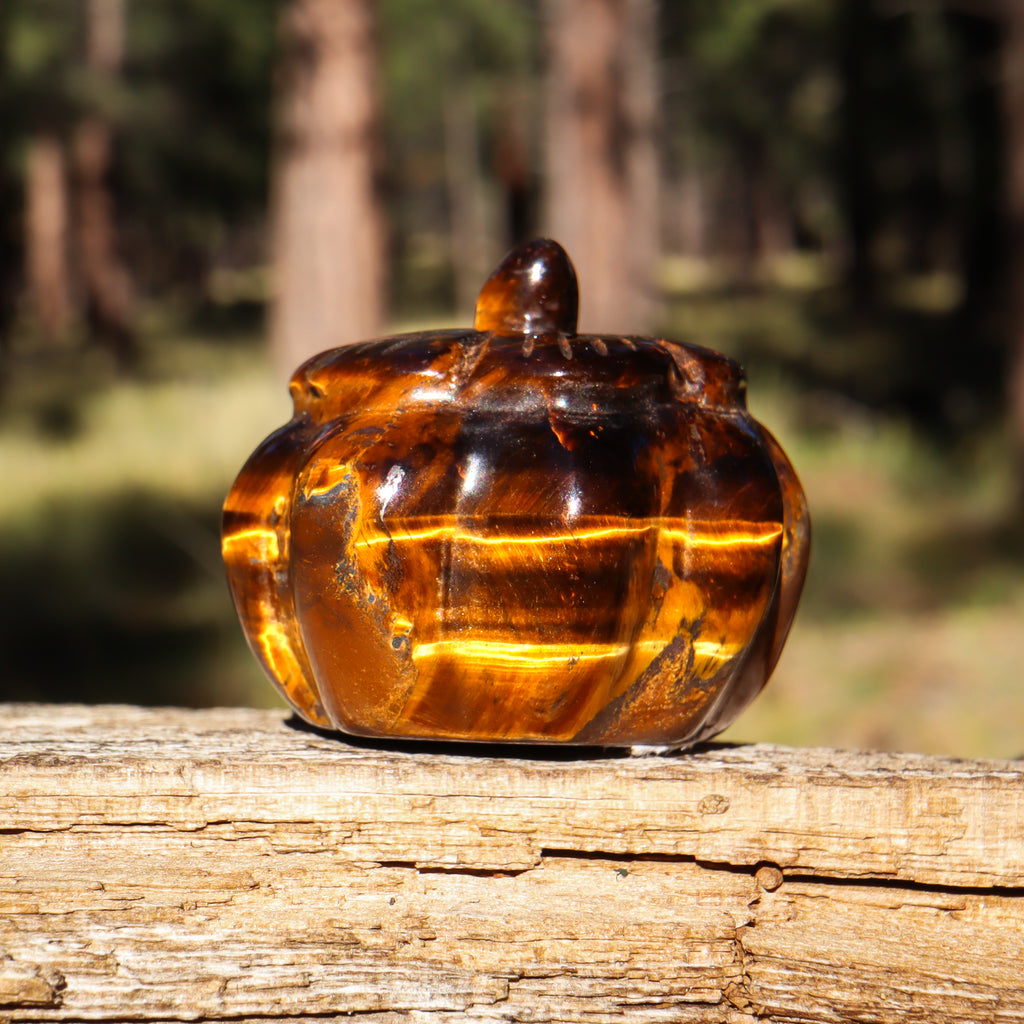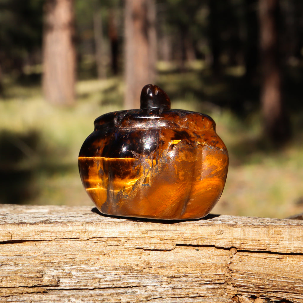 A fun and festive hand-carved Golden Tigers Eye Pumpkin.